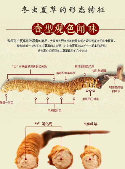 冬蟲夏草被稱為養(yǎng)生界的“軟黃金”,這話不是說(shuō)說(shuō)而已,目前黃金的價(jià)格在285左右,而冬蟲夏草的價(jià)格在200-300之間,是名副其實(shí)的養(yǎng)生界“黃金”。這如此高的價(jià)格之下滋生了一群不法商家,用劣質(zhì)面粉制作假蟲草,更有甚者用亞香棒等形式冬蟲夏草的蟲草冒充,有的為了增加蟲草重量,往上面刷重金屬粉增加重量,這些蟲草吃了對(duì)于人體不僅沒有任何好處,反而嚴(yán)重危害人體健康。今天小編教大家如何鑒別冬蟲夏草?