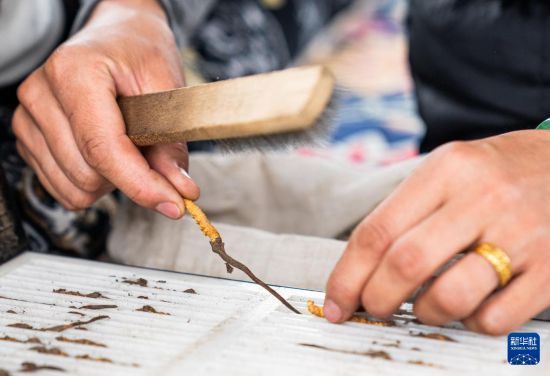 在那曲市索縣西昌鄉(xiāng),牧民白嘎在收納清理好的蟲(chóng)草(5月18日攝)。新華社記者 丁增尼達(dá) 攝